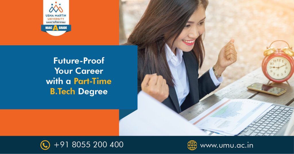 Usha Martin University’s part time BTech course is a future-ready choice for working professionals aiming to advance their engineering careers without sacrificing their current jobs. It offers a flexible learning structure with evening, weekend, and online classes, allowing seamless integration of work and study. The curriculum is industry-aligned, focusing on practical skills and cutting-edge technologies that enhance employability. With AICTE and UGC approval, UMU provides a credible degree recognized nationwide. The program’s affordability, strong industry connections, and career support services enable professionals to upskill, open new job opportunities, and build a robust career while balancing personal commitments.